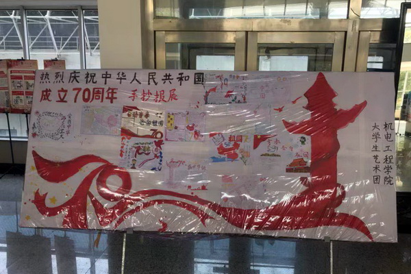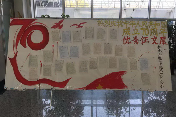 2019年9月27日,在科研楼一楼中厅开展手抄板的展示同学们用画笔勾勒了祖国的壮美河山。最终,施建军同学获得手抄报一等奖,张鹤钰等2名同学获得二等奖,郭云瀚等4名同学获得三等奖,崔博文等5名同学获得优秀奖。